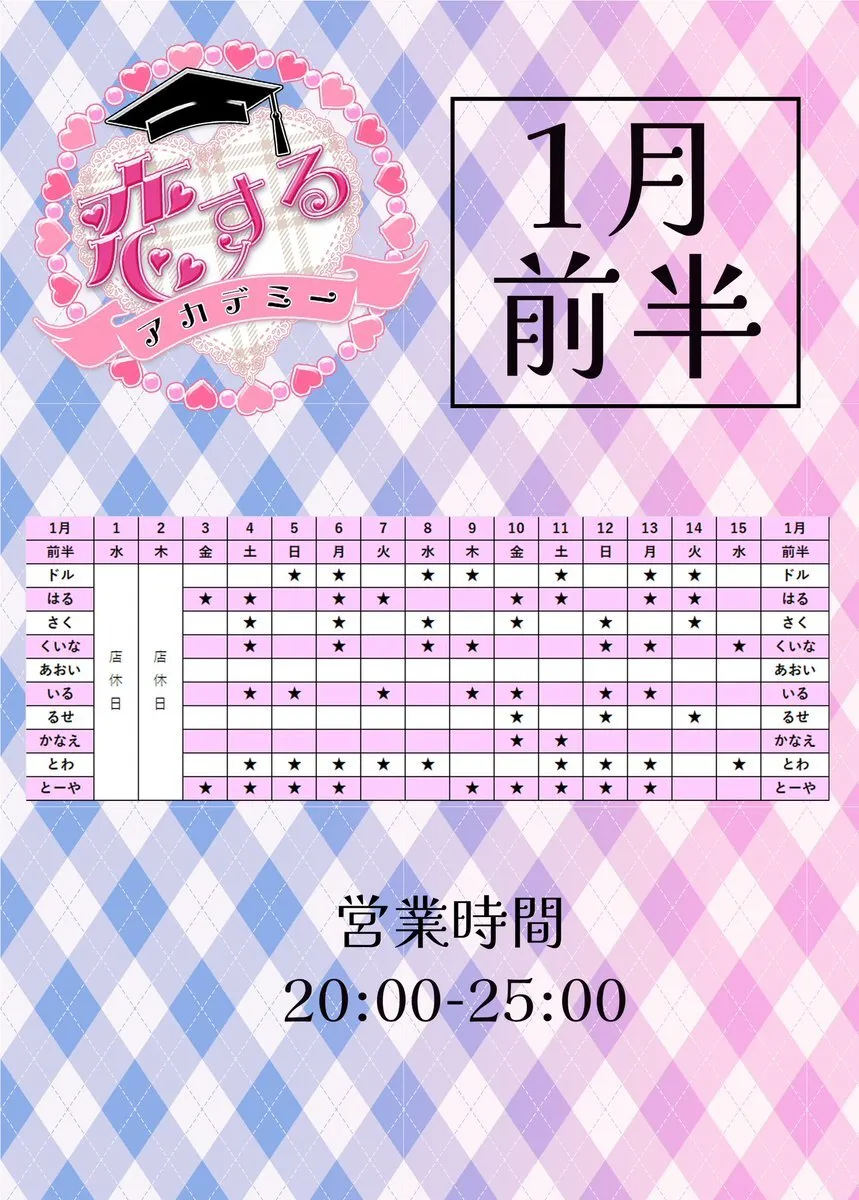 お待たせしました! 1月前半のシフトです! あけましておめでとうございます🌟 今年もよろしくお願いします🌟 #メンズコンカフェ #コンカフェ #歌舞伎 pic.x.com/zNL3qbltoA