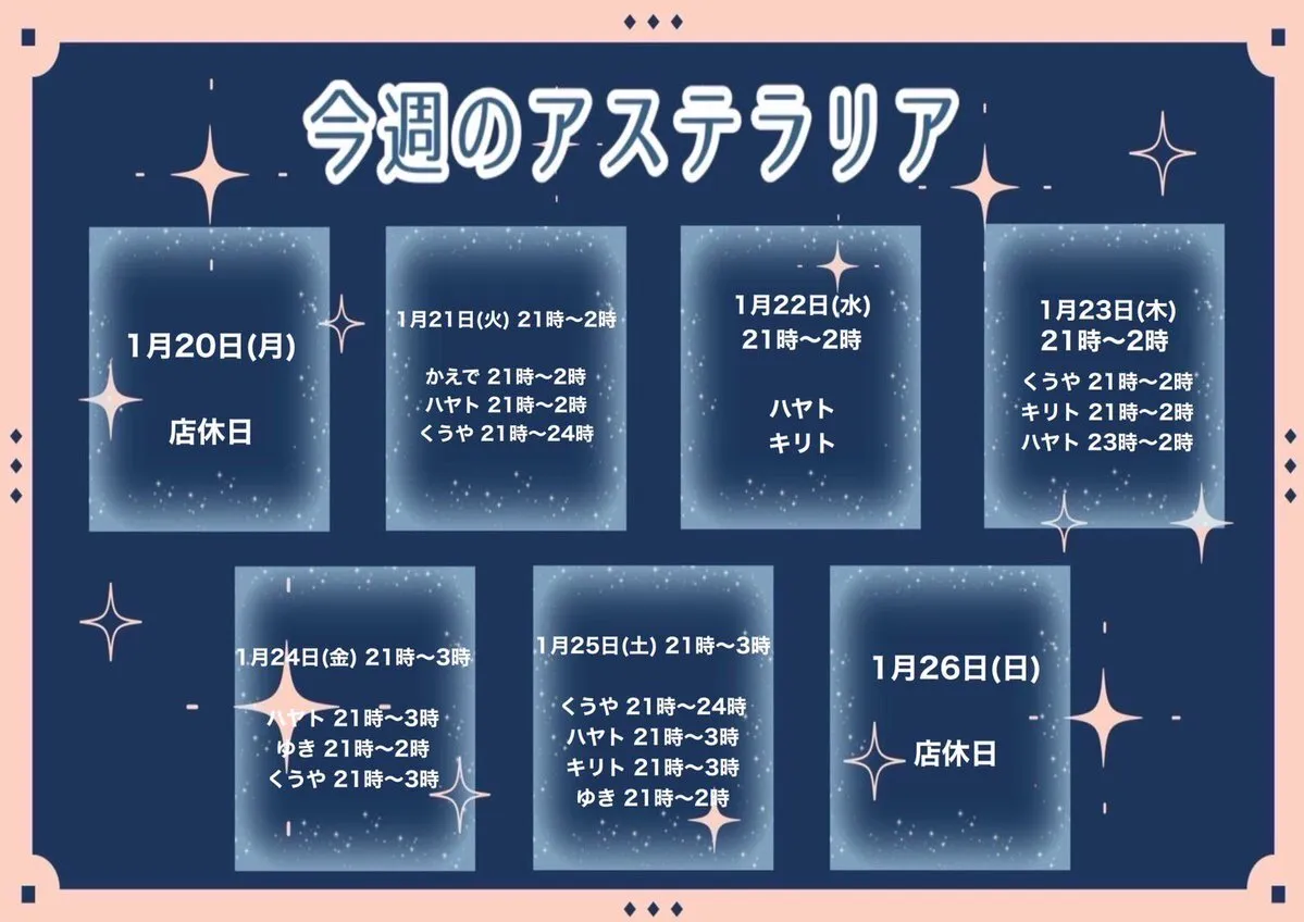 🌙 1月14日(火)21時〜24時 ⭐️ キリト21時〜23時30分 ハヤト21時〜24時 クウヤ21時〜24時 #札幌 #コンカフェ pic.x.com/2PBUr6AvGZ