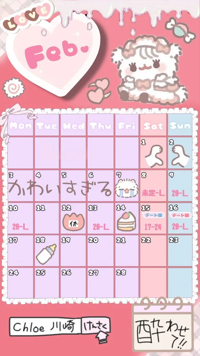 ♡ おきゅよてい ♡ 2月後半はこれ!頑張るのでつ⊂( ᴖ ̫ᴖ)⊃ #コンカフェ @kawasaki_chloe pic.x.com/Jkt0kTjq3G