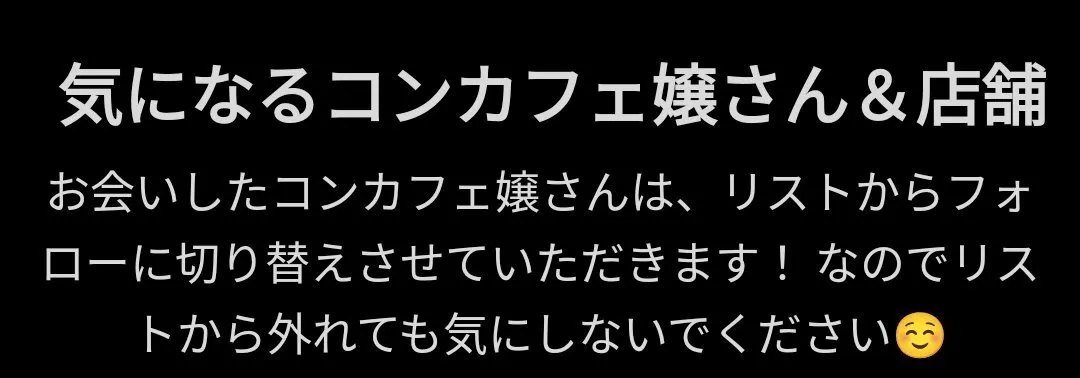 片側交互のフォローばかり増えてもあまり良くないと思うので(バンされたりする可能性がある) 気になるコンカフェ嬢さんとお店のリストを作りました。登録されて嫌な方は言ってください🙇🏻 フォローしてないのにリスイン⁉️と思われた方はご一報くださいフォローします🙇🏻🙏🏻 ̖́-