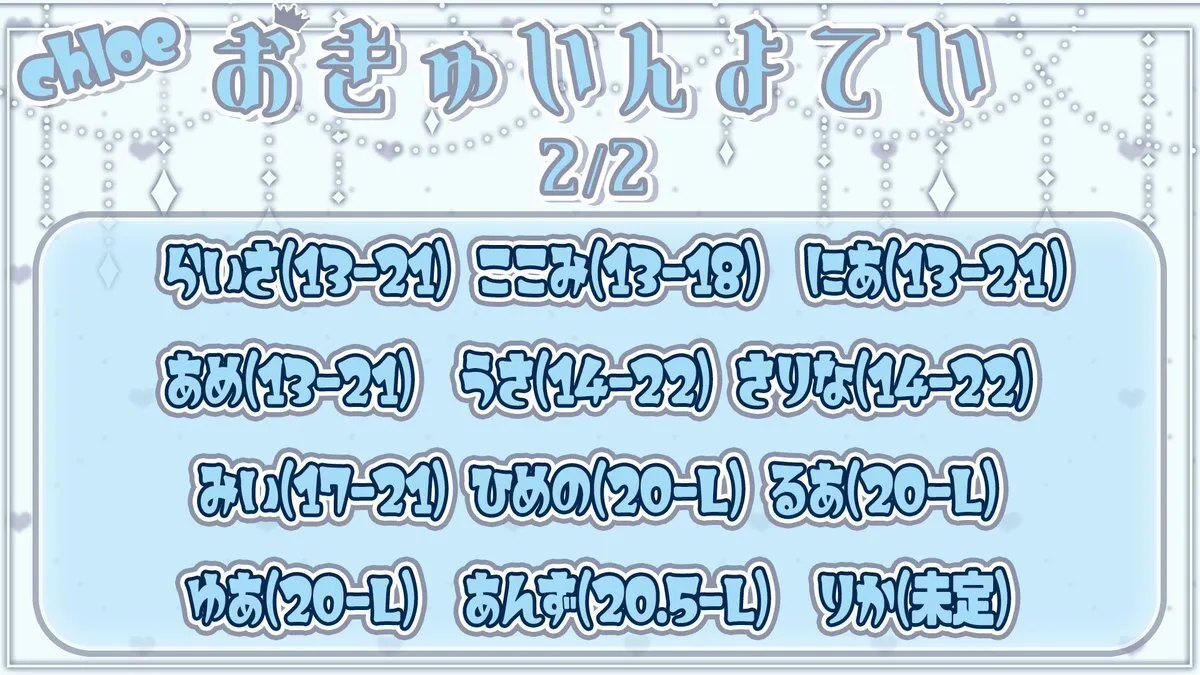 👑本日の出勤メンバー👑 ・ライサ@Chloe_Raisss ・ここみ@chloe__ccm ・にあ@ChIoe_nia ・あめ@Amechan_nya ・うさ@usachan_chloe ・さりな ・みい@chloe_michan ・ひめの@chloe_himeno ・るあ@__rua3_ ・ゆあ@yua_nemutai_ ・あんず@anzu_chloe ・りか@Chloe_rika22 #コンカフェ #川崎 pic.x.com/UL5AnlVmRD