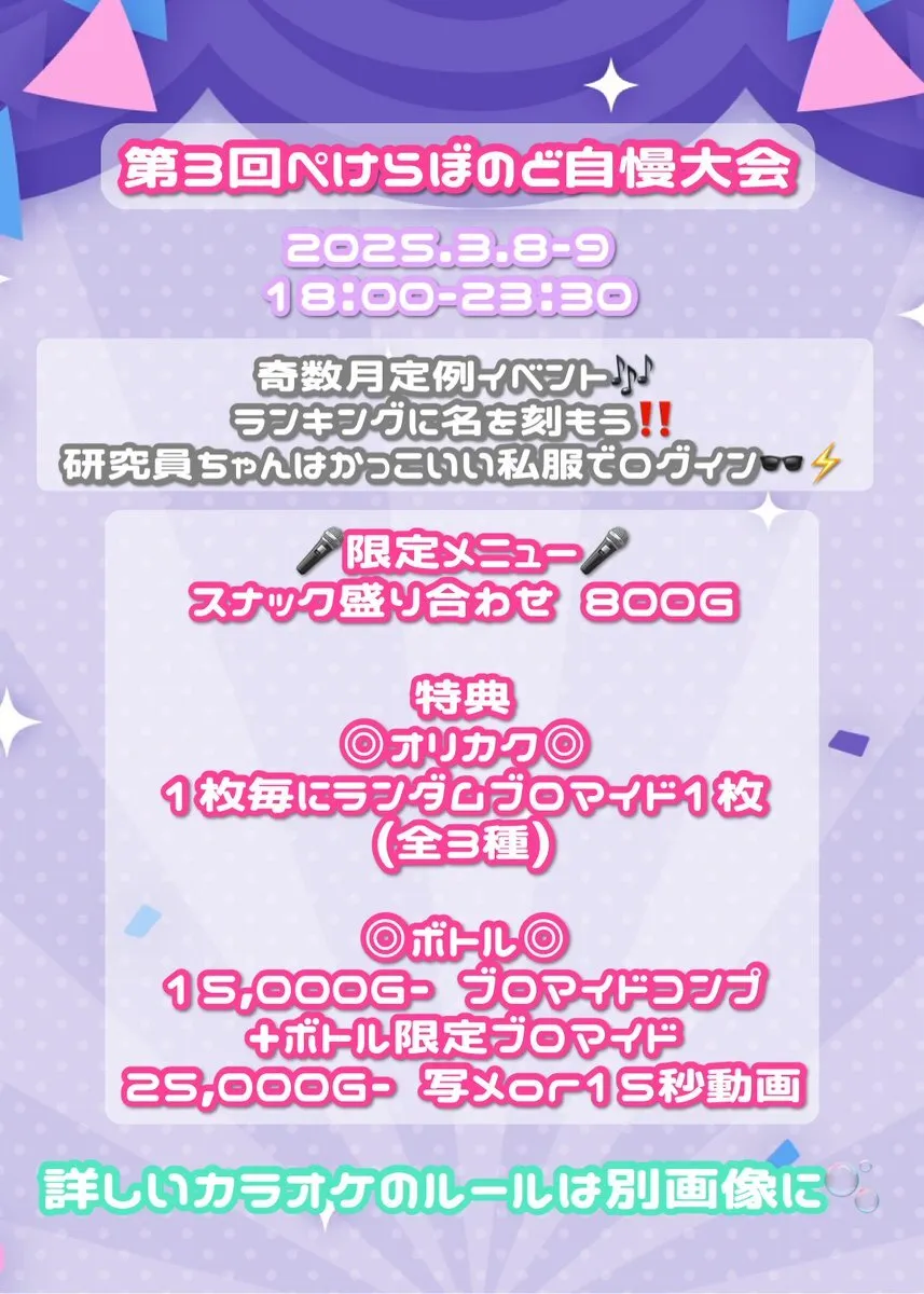 今週末のイベント🧪📟 今週末はひさしぶりののど自慢大会🎤🎶🎶2025年初だよ✨🌟✨ 今回も豪華特典付き‼️ 歌って飲んで楽しんじゃおう🫨🫨 研究員ちゃんの私服も見に来るしかない✊ 詳細は画像をチェック✅✅✅ #池袋 #コンカフェ pic.x.com/hAejUCkmhq