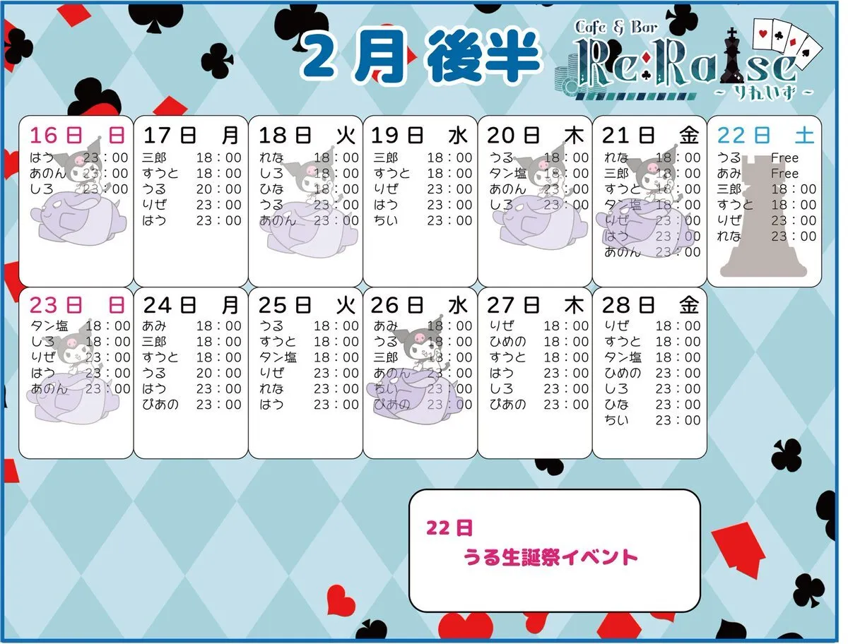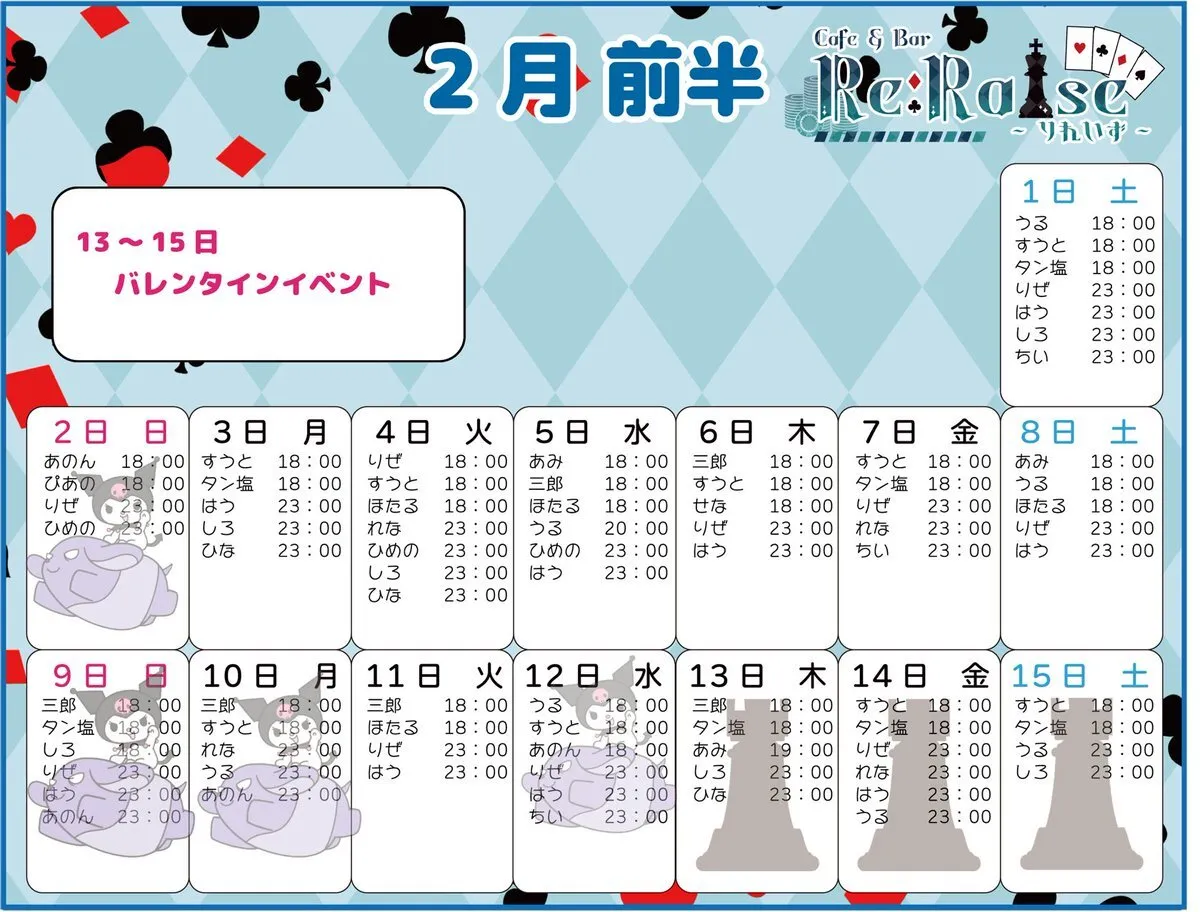 2月前半‼️ 出すの遅くなりました💦 バレンタインイベあるので もし、来店などあれば連絡ください🥲 今月は誰に会えますか〜( ߹꒳߹ ) #コンカフェ大阪 #コンカフェ営業 #コンカフェキャスト #コンカフェ好きと繋がりたい #ミナミ #大阪 #宗右衛門町 #コンカフェ pic.x.com/HaJ7qFFpCB