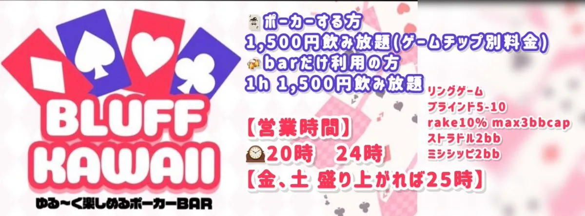 ポーカーコンカフェ 2月最終日 #ブラフカワイイ オープンしました❣️ 🃏ポーカーする方 1,500円飲み放題(ゲームチップ別料金) 🍻barだけの利用の方 1h 1,500円飲み放題 【営業時間】 🕰️20時〜24時 【金、土盛り上がれば25時】 🃏住所 大阪市中央区宗右衛門町5−11 日宝宗右エ門町エイトビル803 pic.x.com/JXzWHuvGCm