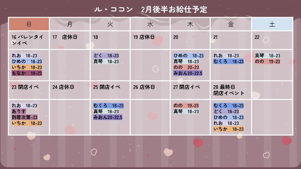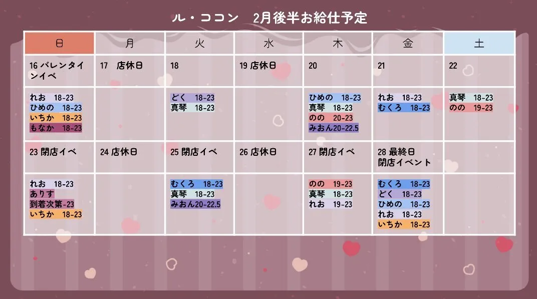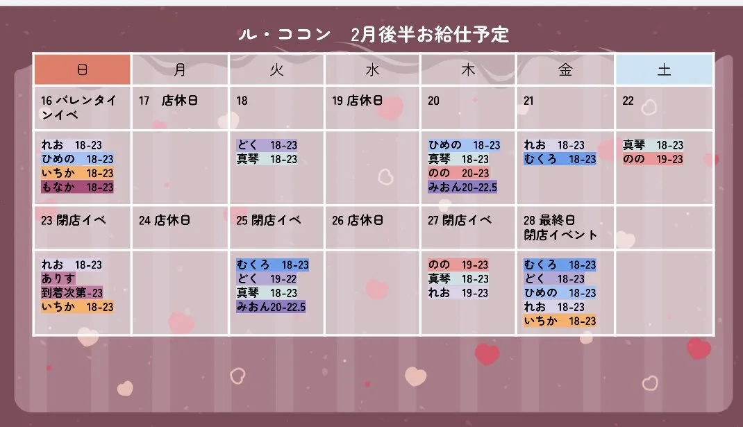 ♡2月後半お給仕予定最新版です!♡ 月、水曜日→店休日 2/23-2/28→閉店イベント です! ご帰宅お待ちしております♪ #池袋 #コンカフェ pic.x.com/CL5FSVnUg4