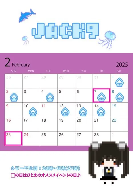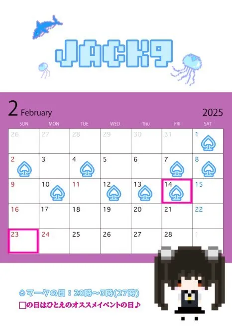 2月前半の予定がわかったのでさっそく作りました〜♪♪♪ 今月も特別なイベントも盛りだくさんなのでぜひぜひチェックして遊びに来てくれると嬉しいです(๑˃̵ᴗ˂̵)✨ 🔽ひとえの注目イベントは…こちらです♪ ・2/14(金) あなたにオールイン♡ ・2/23(日) JACK9☆コンカフェDAY… pic.x.com/MD7frKrkQ4