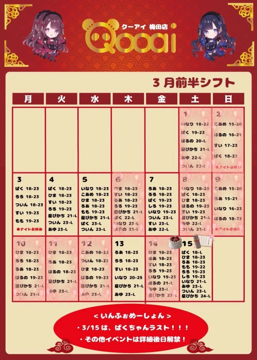 \3月前半出勤予定/ お誕生日月&コンカフェ(ほぼ)1周年㊗️ お祝いしてくださいᐡ⸝⸝> ̫ <⸝⸝ᐡ 15日がリアバなので、14日のナイトにひそっりとカウントダウンします🎂 待ってるよ( ̳- ·̫ - ̳ˆ )◞❤︎ 15日はぱくちゃん卒業です🥲🌸 私出勤できないから代わりにみんなお祝いしてきてください(><) pic.x.com/F3FsUi7OaC