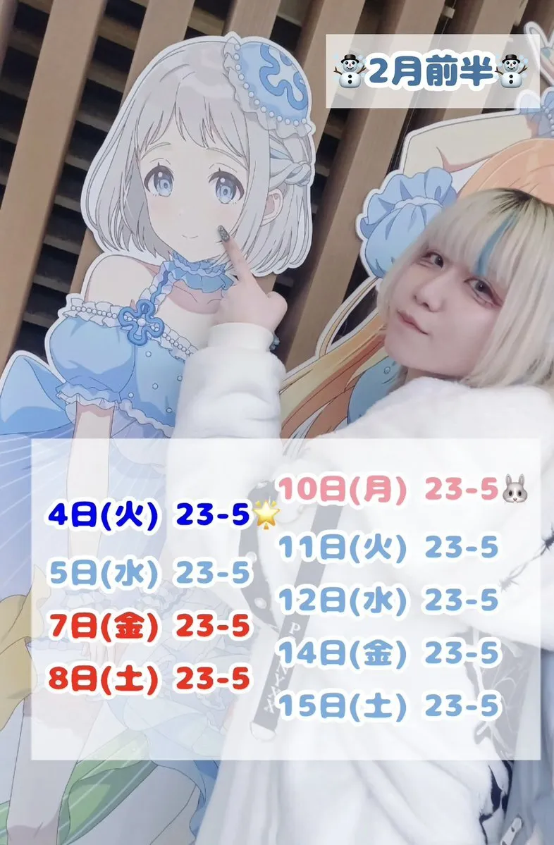 ⛄️【2月前半】⛄️ 出勤予定です⚡️ 🩵ギルド新宿 ❤️メイドギルド 💙銀河 🩷らぶでじ(@Love_U_daisy ) らぶでじ初めてだ~🐰 各店イベント等は後日お知らせあると思います‼️ 追加あったら引リツかツリーでお知らせするのでちぇっくお願いします💭 #コンカフェ #アニソンバー #新宿 #歌舞伎町 pic.x.com/c8RyJR5akj