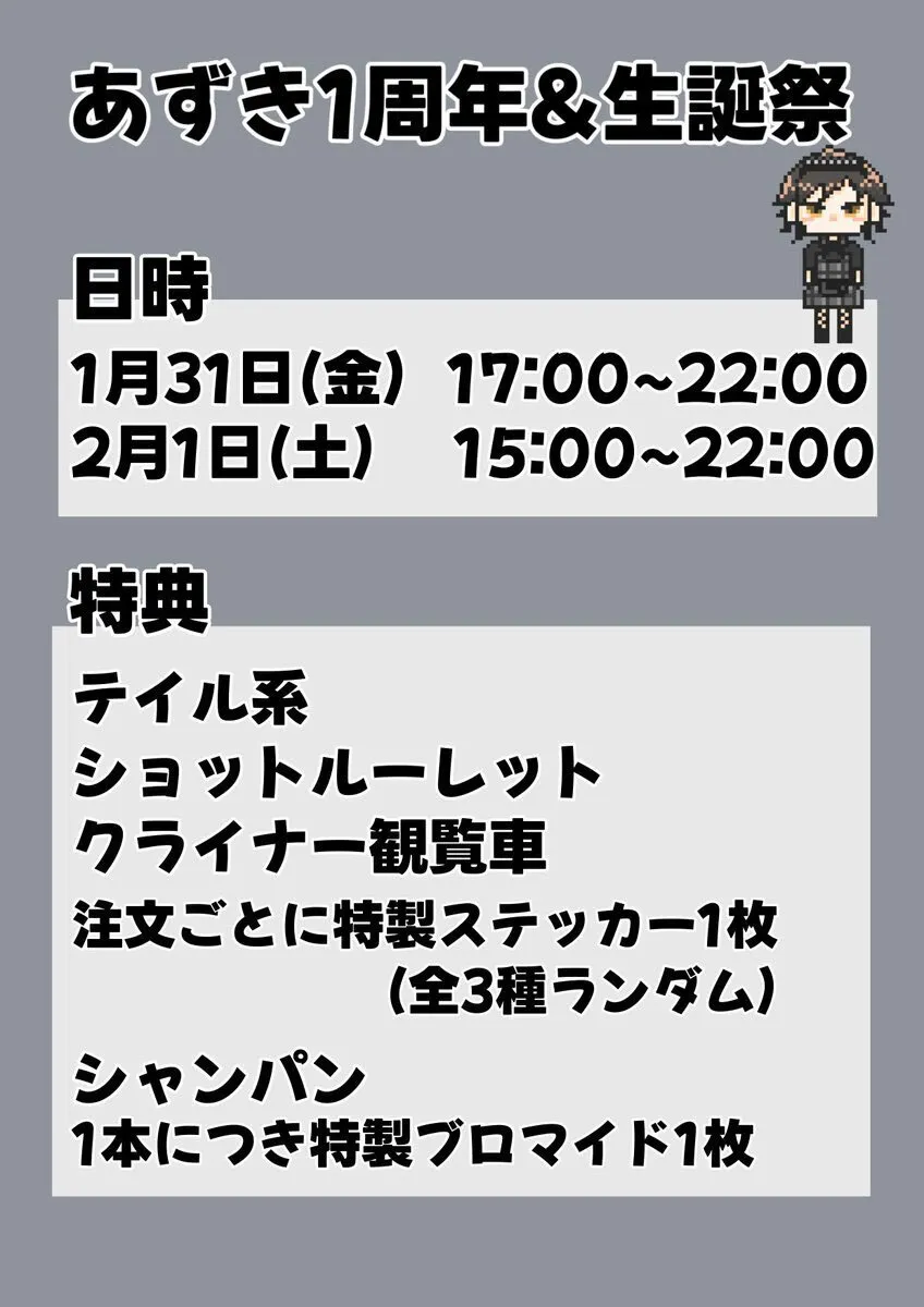 ⛓️入所⛓️ 本日はついにあずきの生誕&周年イベントです✨ あずきにお酒の美味しさ&楽しさを伝えるためにも一緒に乾杯させてくれたら嬉しいです〜( ; ; )一緒にお祝いしてくれる方お待ちしております❕ あずきの肝臓になる!!!!!👊👊👊🔥 のあは22:00までお待ちしています❕ #コンカフェ #秋葉原 pic.x.com/EEjKLg3vvi