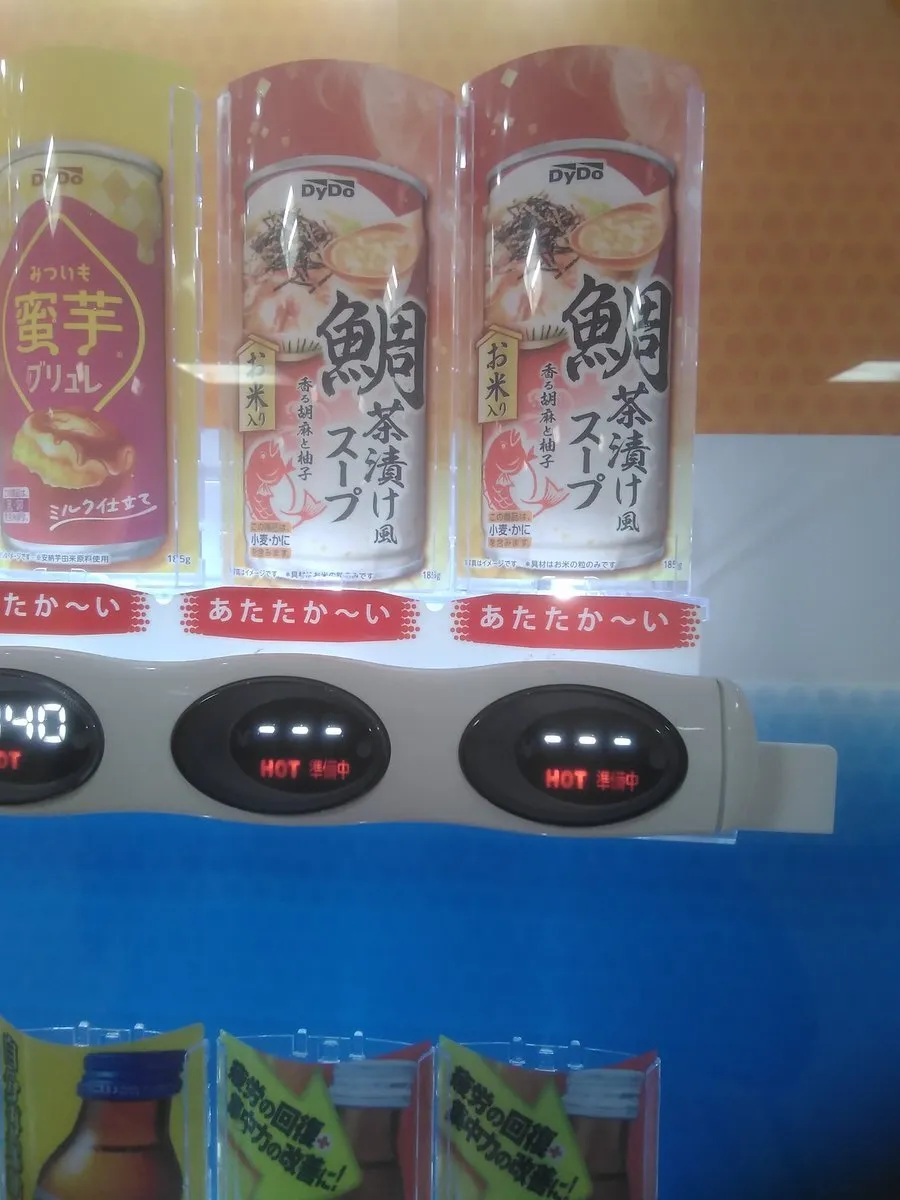 土日に名古屋行った時、大須のタイステの2階隣にある馬券売り場外にある自販機(コンカフェの隣でもあるか🤔)に「鯛茶漬け風スープ」が販売予定みたいだが、米入ってるみたいだからやっぱ食感は缶の甘酒のに近いのだろうかw😅? 2008年に「まんだらけ」横の自販機に「ラーメン缶」もあったなぁw😅 pic.x.com/v9ah5jWUmd
