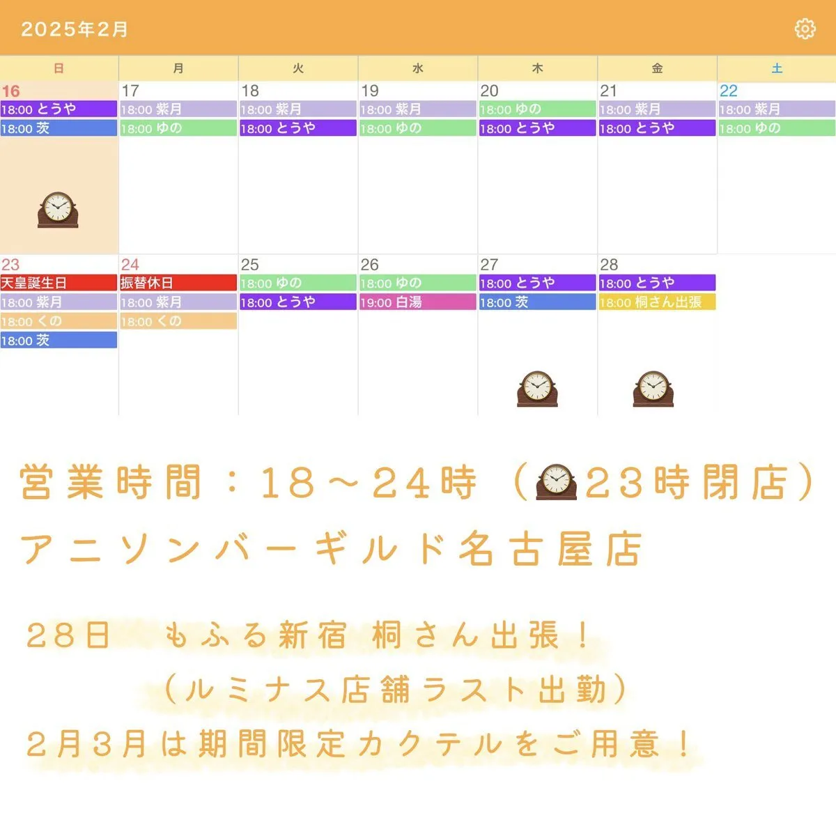 💞ギルド名古屋店 2月後半シフト💞 1周年イベントにお越しくださり ありがとうございました🎉 限定ドリンクは引き続き提供中☕️ 新人さんも増えたぎるなごを 今後ともよろしくお願いいたします🙇 皆様のご来店をお待ちしております🔆 #アニソンバー #コンカフェ #名古屋コンカフェ #栄コンカフェ pic.x.com/xIB5oLq98s