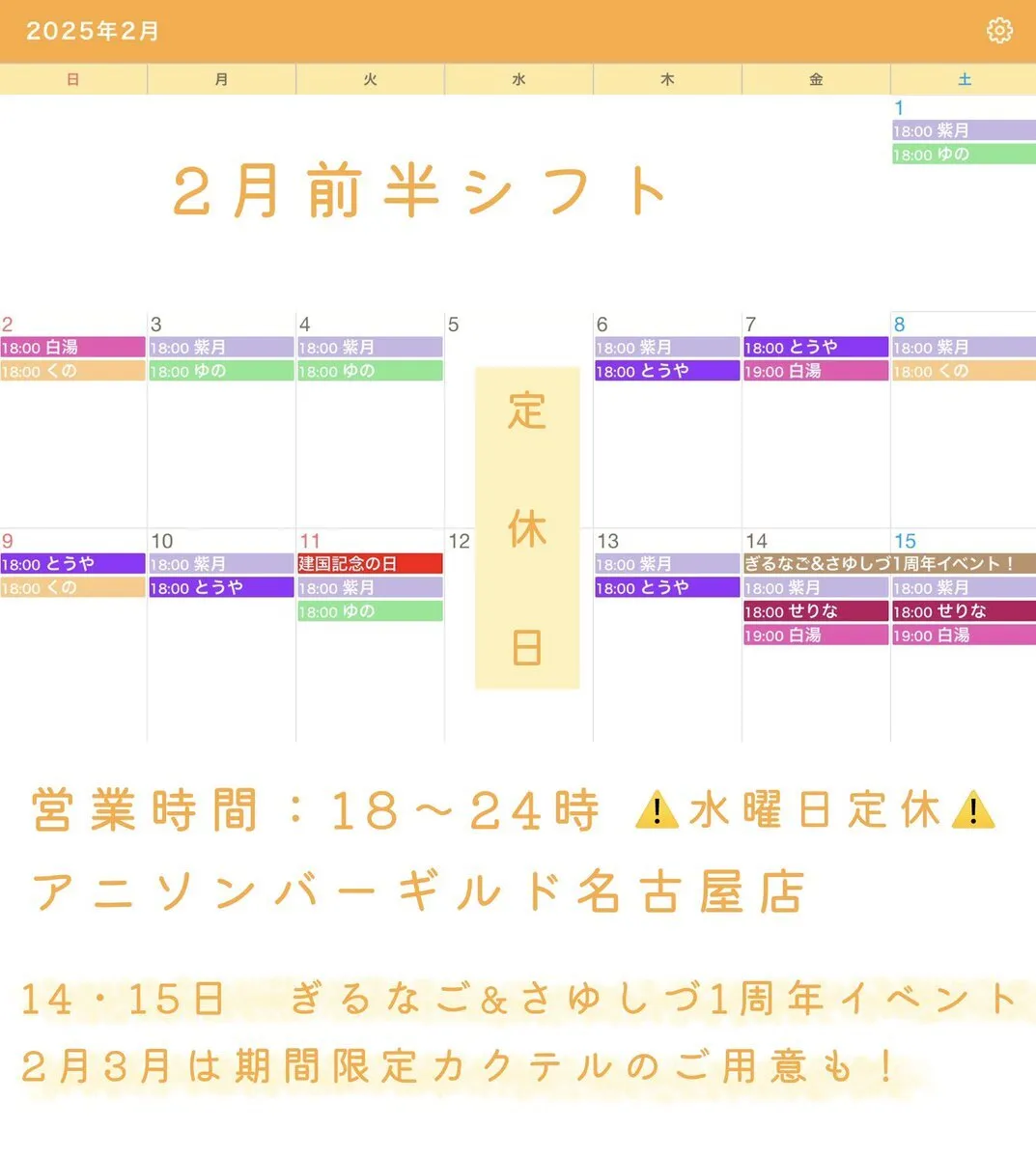 💞ギルド名古屋店 2月前半シフト💞 ついにぎるなご1周年!🎉 今後ともどうぞよろしくお願いいたします🙇 2〜3月の限定ドリンクも ご用意しましたよ☕️ ⚠️水曜定休となりますのでご注意ください 皆様のご来店をお待ちしております🔆 #アニソンバー #コンカフェ #名古屋コンカフェ #栄コンカフェ pic.x.com/aGRhtUVHZs x.com/guild_nagoya/s…