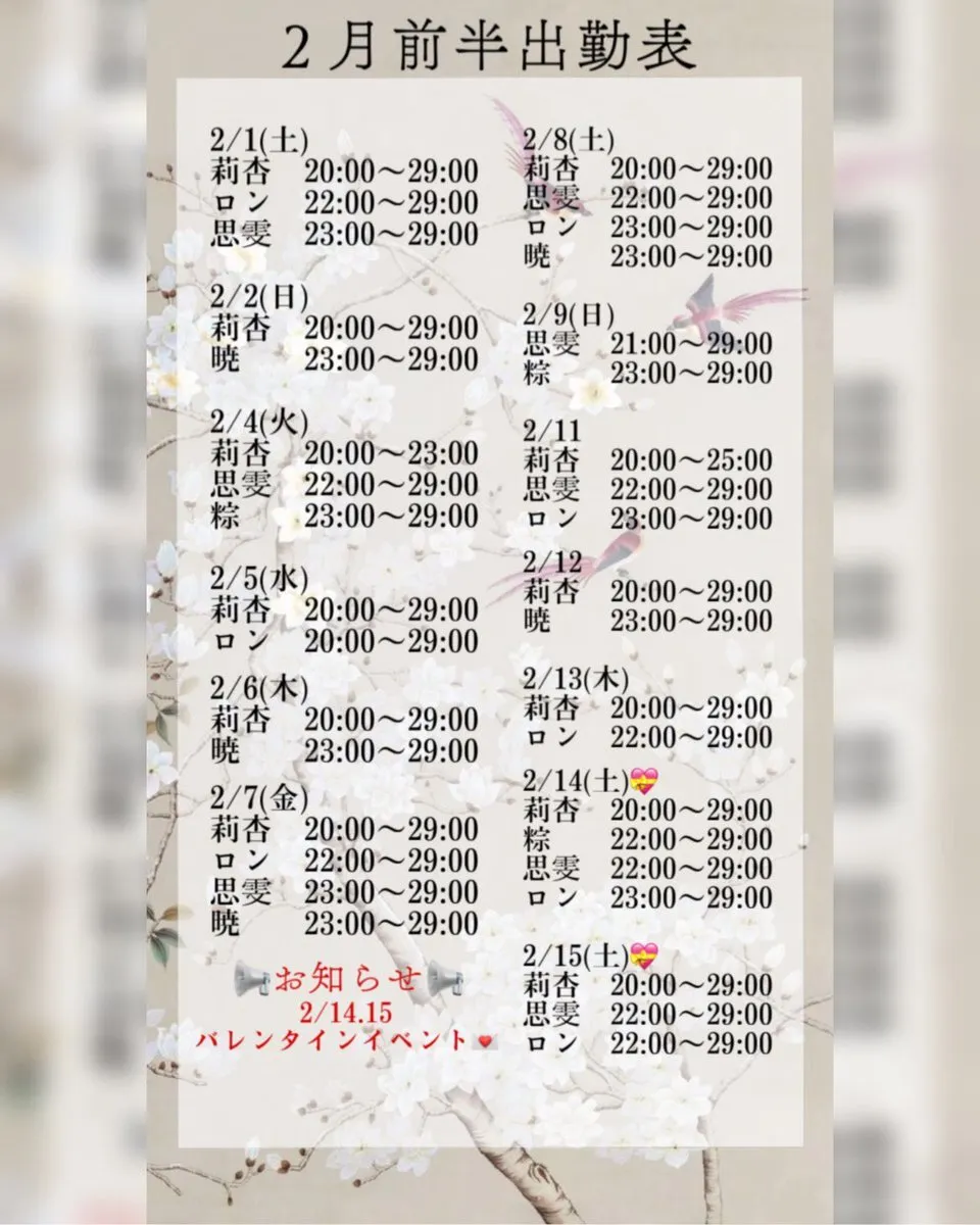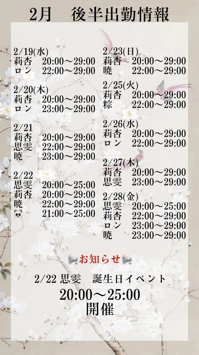 🐼2月みんなの出勤予定表です🇨🇳 ぜひ、ふらっと遊びに来てください◎ 22日は思雯さんのお誕生日イベント❣️オリジナルシャンパンや豪華特典もご用意しております💌 沢山の来店お待ちしております! 🍸オリカク強化❕10杯頼むと推しのブロマイドget❕ #コンカフェ #シーシャ #仙台 #国分町 pic.x.com/4Zhb8v8dF0
