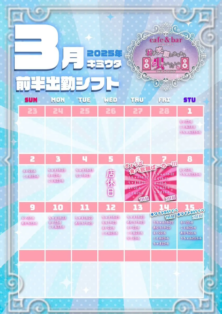 3月前半スケジュール𓏸𓂂𓈒📢 🗓6.7日 ぎょうざぱーちー!🥟 🗓14.15.16日 ホワイトデーイベント🩵🎁 🎂21日 あむち生誕 🗓28.29.30日 大正浪漫イベント ご新規様飲み放題1H¥1,000 #大阪 #ミナミ #コンカフェ pic.x.com/gqQvRA0IiQ