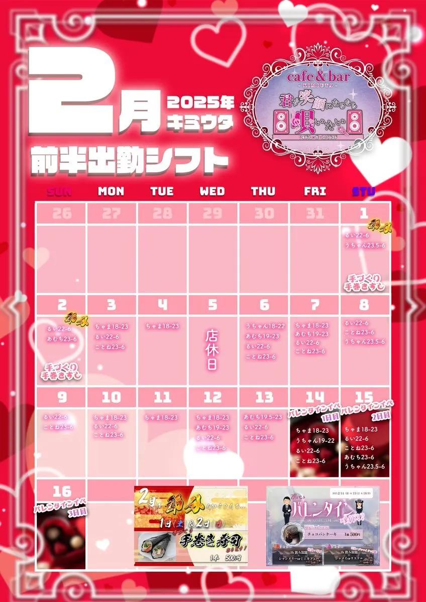 2月前半スケジュール𓏸𓂂𓈒📢 🗓️1.2日 恵方巻きあります👹🫘 🗓5日 ミーティングの為各キャストにご連絡ください 🗓14.15.16日 バレンタインイベント❤🍫🎁 ご新規様飲み放題1H¥1,000 #大阪 #ミナミ #コンカフェ pic.x.com/ezbxkwHrRl