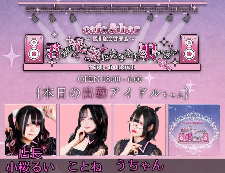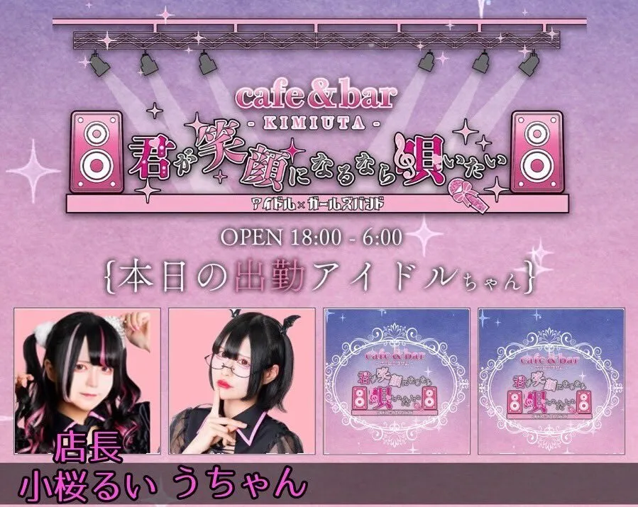 Cafe&bar 君が笑顔になるなら唄いたい 本日のアイドルキャストは🎤 22- 小桜るい@Kozakura_rui 23- ことね@Kz_zo0 皆様のお越しをお待ちしております🥰 #コンカフェ #ミナミ #大阪