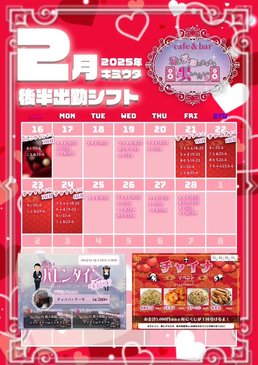2月後半スケジュール𓏸𓂂𓈒📢 🗓21.22.23日 チャイナイベント🐼 ご新規様飲み放題1H¥1,000 #大阪 #ミナミ #コンカフェ pic.x.com/WEGocyDVSZ