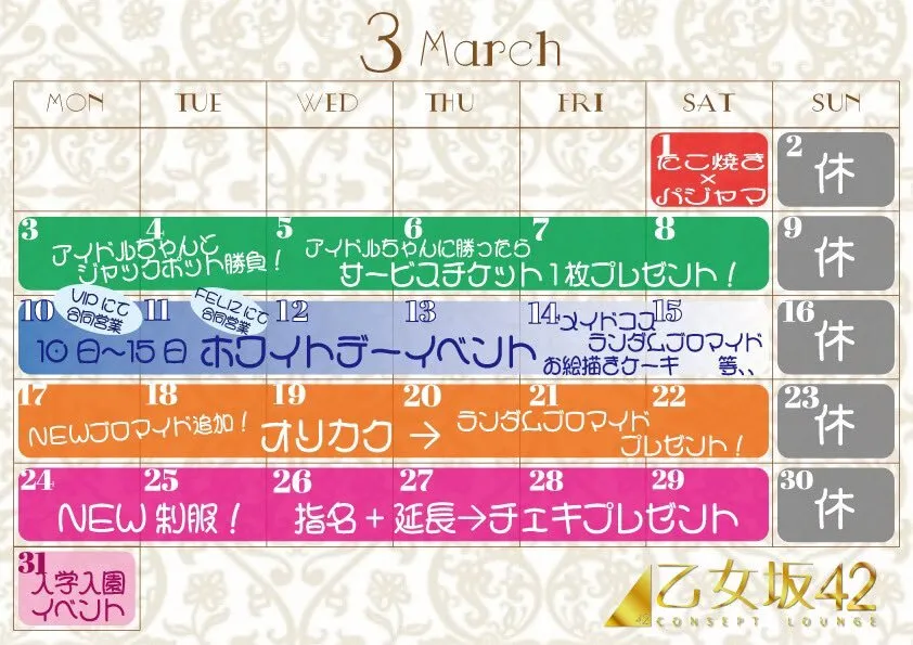 3月のイベントです^_^ 3 19:00〜23:00 4 19:00〜23:00 6 19:00〜23:00 7 19:00〜23:30 13 19:00〜23:00 14 19:30〜23:30 でいます^_^ @otomezaka42_vip で会えます^_^ #コンカフェ #コンカフェ嬢 #コンカフェ営業 pic.x.com/J3hvwLekfA