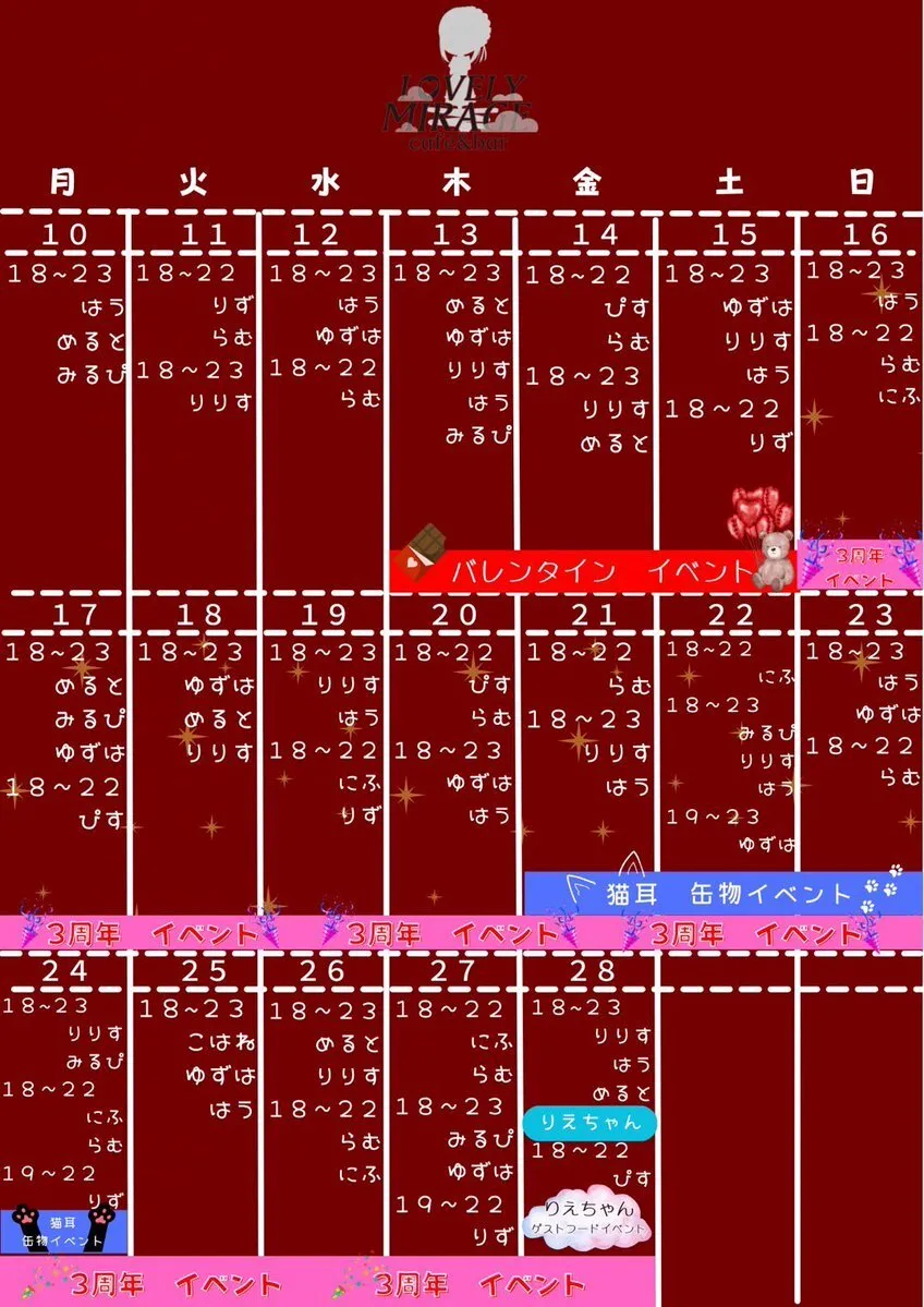 2月後半のお給仕表です🔱 16日〜28日まで3周年イベント‼️‼️‼️ ご新規様超お得の¥500❤️🔥 21日〜24日 猫耳缶物イベント😽 28日 りえちゃんゲストフード💞 @momomirie_ #ミナミ #コンカフェ #宗右衛門 pic.x.com/H3etEsCirF