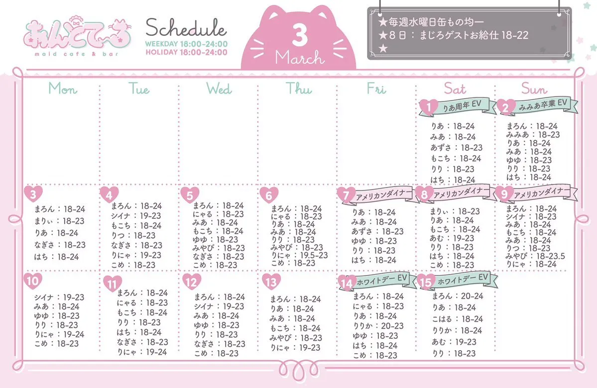 ✦┈┈┈┈┈┈┈┈┈✦ ❤︎3月前半お給仕よてい❤︎ ✦┈┈┈┈┈┈┈┈┈✦ 1.りあ周年&キャストリーダー就任🖤⋆͛*͛ 2.みみあ卒業🌸 7~9 アメリカンダイナー🇺🇸🍟🍔 8. まじろゲストお給仕🐹 14~16 ホワイトデーイベント🤍 3月は枢木Pの生誕祭もあります🐈⬛♡ #コンカフェ #歌舞伎町 pic.x.com/9Oxpkyh3eI