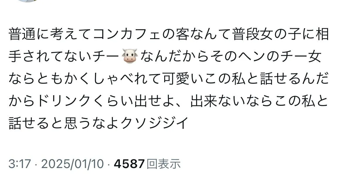 こういうの見ると怖くなるんです。コンカフェ行くのも不安になる、、自分のことってわからないってよく言うけど、、おれもクソジジイなのかな、、そうなのかもしれないな、、消えたくなる😢 pic.x.com/CKSpd1czRE