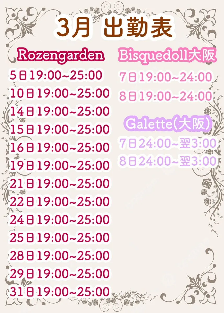 〔 3月𓂃𓈒𓏸コンカフェ出勤予定 〕 ローゼン1周年、待ってます🥀 5日▷コスプレday 14.15日▷童話イベント 22日▷ローゼン1周年 営業時間 ▶ 18:00~25:00(lo.24:00) 場所 ▶東京 @Rozengarden_bb 大阪 @BisquedollOSAKA 大阪 @GaletteOSAKA (深夜) #コンカフェ #歌舞伎町 pic.x.com/da8Jlshkxj