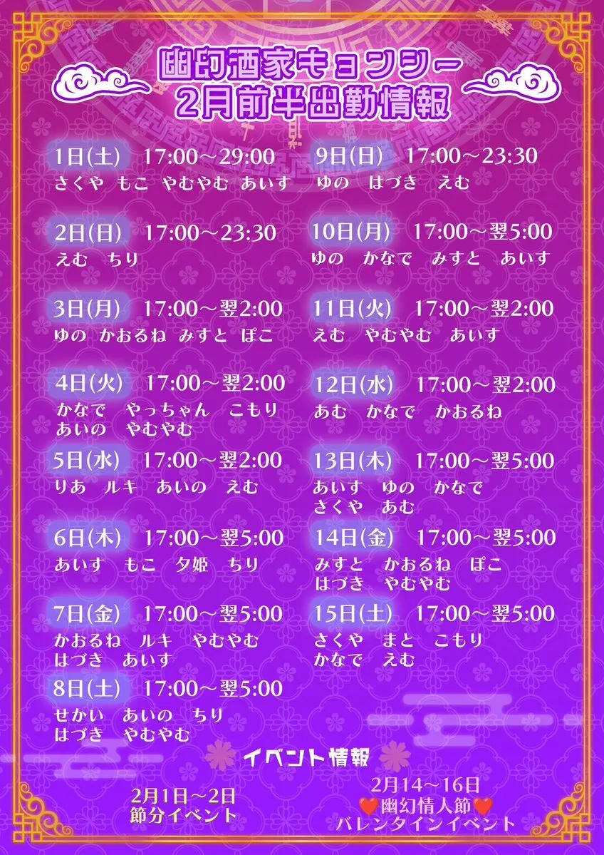 👻幽幻酒家2月前半僵屍一覧表👻 ⏰営業時間 月〜水17:00〜翌2:00 木〜土/祝前17:00〜翌5:00 日 17:00〜23:30 💜イベント 1〜2日👹節分 14〜15日🍫バレンタイン 🉐平日限定19時まで #シーシャ 無料 🉐お友達紹介プレゼントあり 🏢東京都豊島区東池袋1-22-5サンケエビル2階 #コンカフェ #池袋 pic.x.com/hzH40XygS8