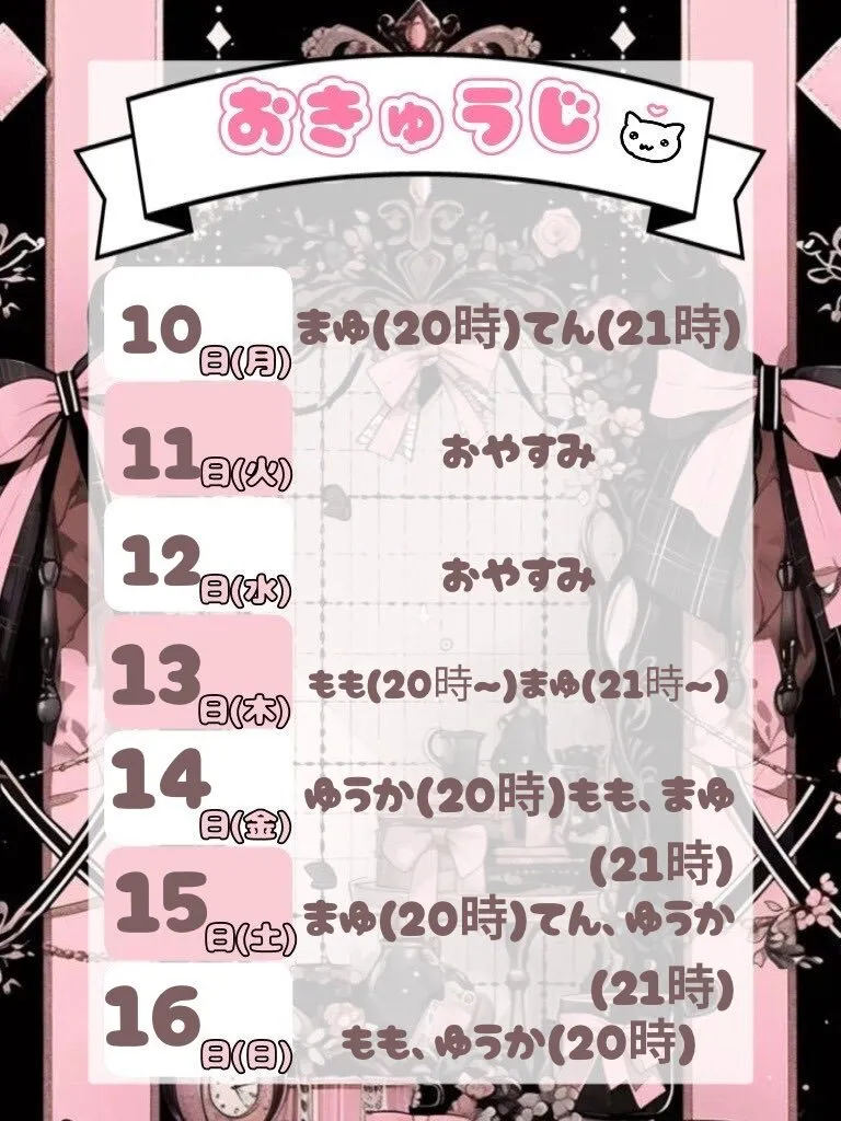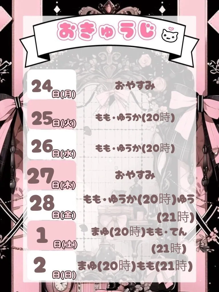 おきゅうじ!! 水 もも@mka_peach0522 ゆうか@Xx_nemuine_xX 木 おやすみ 金 もも ゆうか@Xx_nemuine_xX ゆう@yu_white_angel 土 もも てん@tendayo_x まゆ@0610__mayu 日 もも@mka_peach0522 まゆ@0610__mayu 沢山の御帰宅お待ちしております🏠 #釧路 #コンカフェ pic.x.com/08thXGogip
